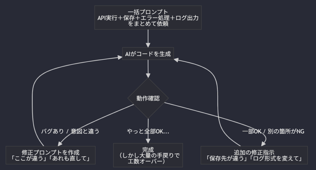 欲張って一度に全部盛り込もうとすると、AIも混乱してバグが出やすくなります。